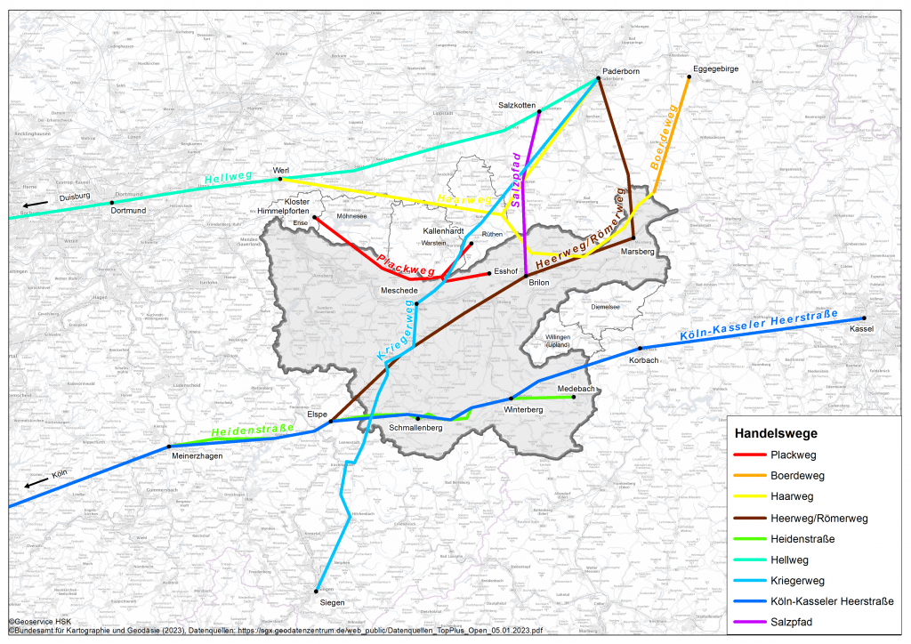 Aus einigen dieser alten Handelswege sind attraktive Wanderstrecken geworden. Manchmal wurde anstelle des Wanderweges auch eine Straße bzw. eine Autobahn gebaut, wie z. B. die A40, entlang des Hellweges. Auch die Jakobs-Pilger nutzten und nutzen die alten Wege, mit den Spuren von Millionen Schritten, die sich fest in die Landschaft geschrieben haben. Teils Hohlwege, die sich durch jahrhundertelange Nutzung bis zu zehn Meter tief in das umgebende Gelände geschnitten haben.