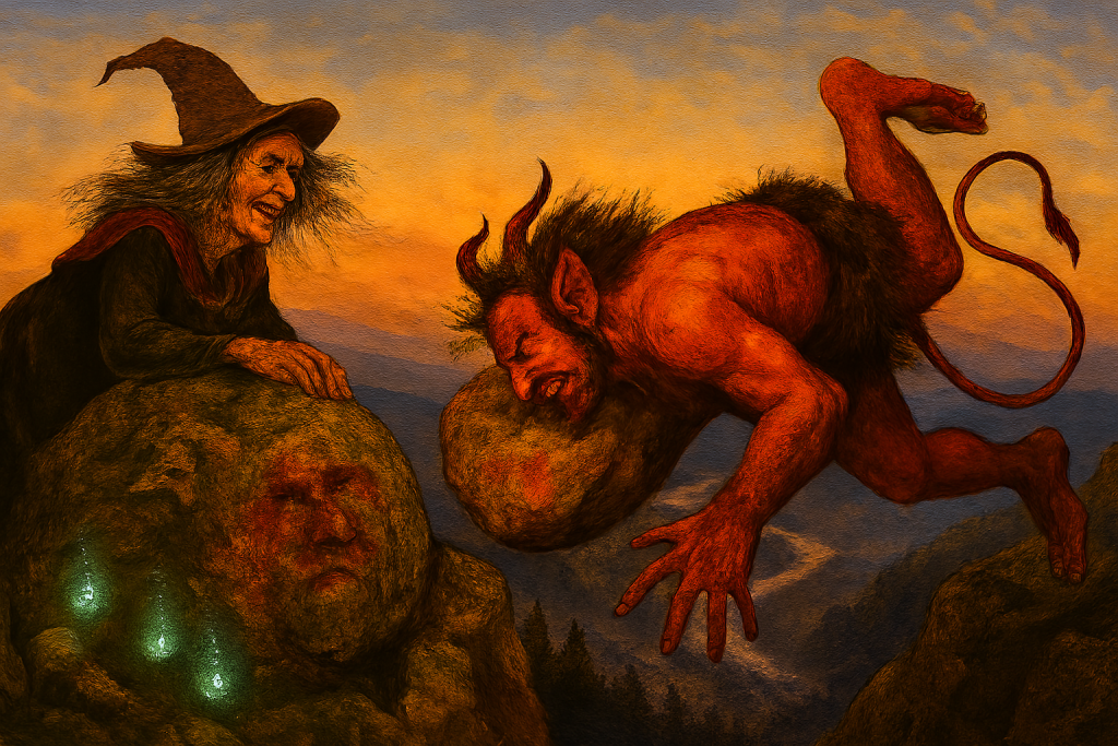 Konkreter und bekannter erzählt uns die folgende Sage von einer Wette um den Goldschatz des Teufels zwischen demselben und der Hexe: In einer Walpurgisnacht tranken Hexe und Teufel reichlich Met und wurden übermütig. Die Hexe schlug vor, der Teufel solle von einem Berggipfel über die Lenne zum gegenüberliegenden Berggipfel springen. Schaffe er es nicht, so bekomme die Hexe seinen Goldschatz. Der Teufel willigte ein, sprang und schaffte knapp die Hälfte, wobei er sich Kopf, Ellbogen und Knie an einem Felsbrocken aufschlug, was wiederum Spuren in dem Stein hinterließ. Die Hexe hatte zwar gewonnen, aber der erboste Teufel verfluchte seinen Goldschatz und versteckte ihn unter dem Felsen, der seine Gesichts- Ellbogen- und Knieabdrücke aufwies. Dieser Goldstein lockte verfluchte Seelen an, die von Wanderern als Irrlichter über dem Sumpf gesehen worden sein sollen.