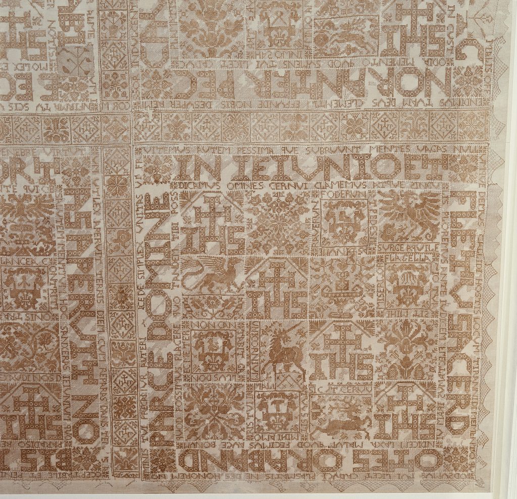 Breite Inschriftenstreifen rahmen die großen Felder. Die Motive wiederholen sich im Rapport, also regelmäßig. In allen vier Vierteln verläuft eine Diagonale aus Bildfeldern mit dem Christusmonogramm „IHS“.