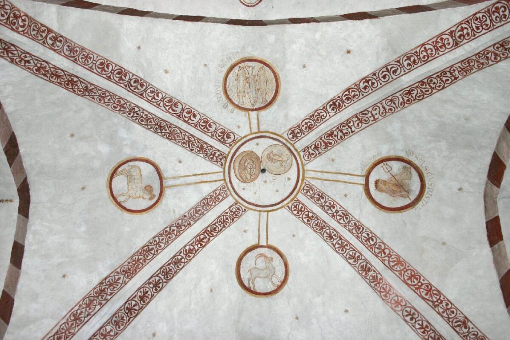 Erst 1953 wurden ganz außergewöhnliche bauzeitliche Ausmalungen entdeckt: In den Gewölbefeldern wurden jeweils vier der Tierkreiszeichen, als Symbole der Zeitlichkeit, gefunden. Auf den Schlusssteinen sehen wir Sonne und Mond. In der Apsis, die heute von dem barocken Hauptaltar verdeckt ist, flankieren Engel Jesus Christus auf seinem Thron. Darunter thronen Apostel, Maria und der Gerichtsengel. Ganz unten finden wir die Auferstehung der Toten mit dem Zug der Verdammten und Seligen.