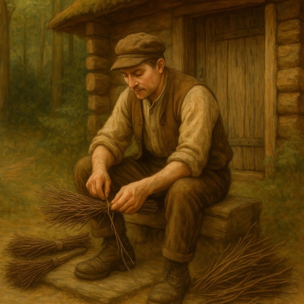 Franz war ein schlichter Mann von festem Wesen und klarem Verstande. Er schlief in der Scheune eines Nachbarn, aß, was der Wald und seine Hände hergaben – und dachte nach. Was tun, wenn die Felder verbrannt, die Tiere tot und das Haus verloren sind? Franz war kein Gelehrter, aber er war ein Macher. Schon bald begann er, mit dem Material zu experimentieren, das der Wald ihm bot. Zunächst schnitt er feines Birkenreisig – nicht zu trocken, nicht zu frisch, damit es sich gut biegen und fest zusammenbinden ließ. Die Zweige legte er auf Länge und sortierte sie nach Stärke.