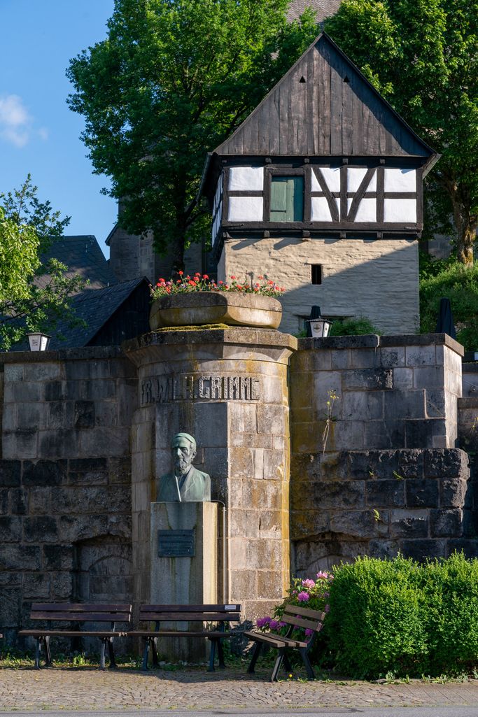 Das Grimme-Denkmal im Assinghauser Dorfzentrum unterhalb des Reisen-Speichers von 1556, dem ältesten Gebäude im Olsberger Stadtgebiet
