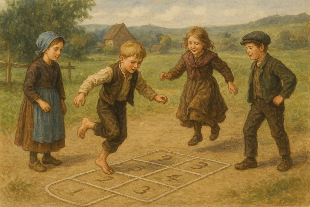 Zu den beliebtesten Spielen gehörten Fangen und Verstecken. Schon die Kleinsten rannten durch Hof und Garten, suchten sich Verstecke hinter Heuhaufen oder Bäumen und juchzten, wenn sie entdeckt wurden. Ebenfalls verbreitet war das Hinkekästchen, heute bekannt als „Himmel und Hölle“: Mit einem Stock wurden Kästchen in den Boden geritzt, in die ein kleiner Stein geworfen und anschließend durchhüpft wurde.