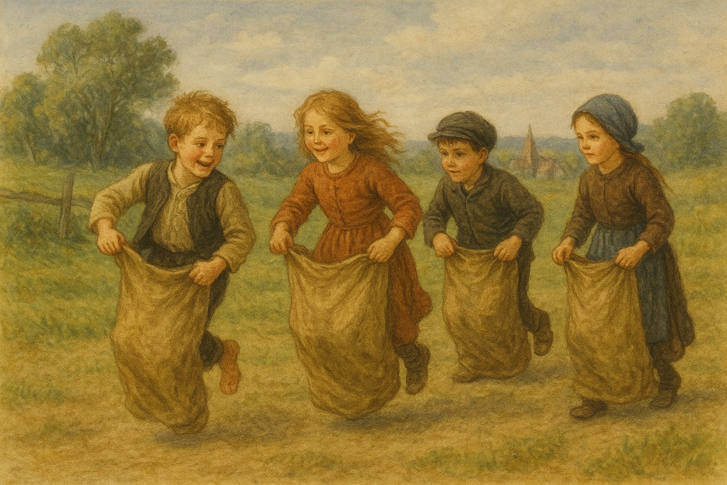 Im Sommer übten sich die Kinder im Stelzenlaufen oder traten beim Sackhüpfen gegeneinander an. Wer am weitesten sprang oder am längsten das Gleichgewicht hielt, war der Held des Tages.