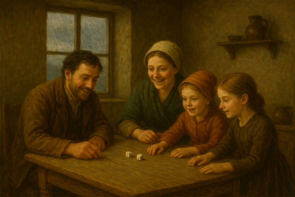 Wenn es regnete und die Kinder in der warmen Stube bleiben mussten, kamen andere Spiele zum Zug. Beliebt waren Würfel- und Kartenspiele, Klatschreime und Singspiele wie „Der Plumpsack geht um“. Oft erzählten die Älteren Rätselgeschichten oder Märchen, die von den Kindern später nachgespielt wurden.