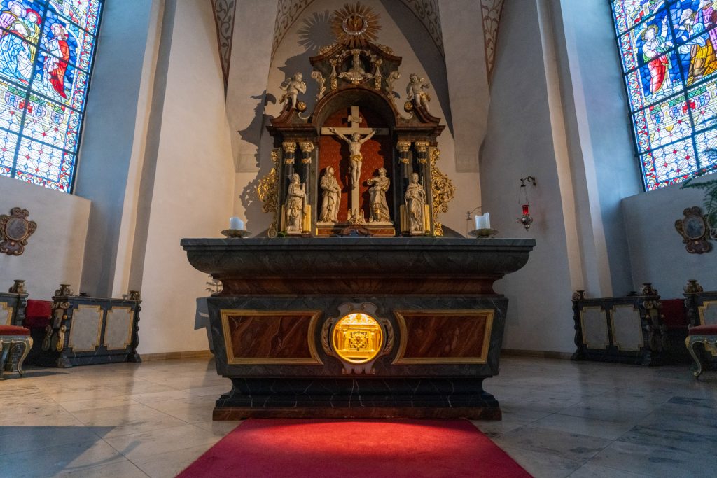 Früher war es üblich, bei Altarweihen Reliquien einzulassen. Visitationsberichte und Chroniken belegen diese Praxis. Auch St. Peter und Paul besitzt ein außergewöhnlich reiches Reliquiar: Im Opfertisch befindet sich ein fest eingebauter Behälter, in dem ein dunkelroter Samtbeutel mit Reliquien aus der Cyriacus-Katakombe in Rom verwahrt wird. Darin liegen Reliquien verschiedener Heiliger, Partikel vom Heiligen Kreuz sowie Berührungsreliquien an die großen Passionsreliquien: Kreuz, Schweißtuch, Lanze.